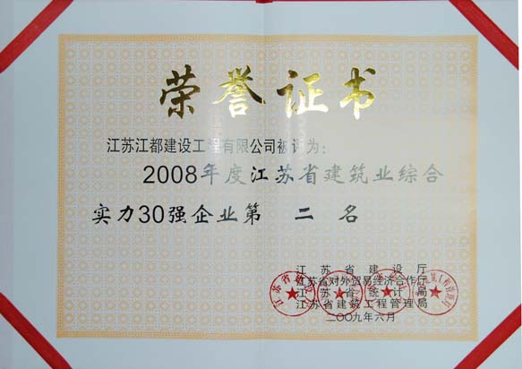 2008年度江蘇省建筑業(yè)綜合實(shí)力三十強(qiáng)第二名